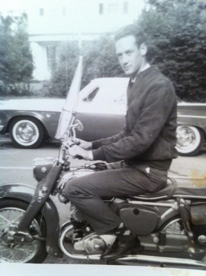 Steve on motorcycle (2) (299×400) Published September 12, 2012 at 299 × 400 in Oblivious Dreaming Little 6’8″ Steve on his motorcycle with Studebaker Hawk behind