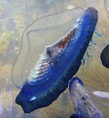 Apologies to By-the-Wind Sailors for calling them jellyfish. They are not jellyfish. A by-the wind sailor has a sail. Jellyfish have no sail; they just bob around.