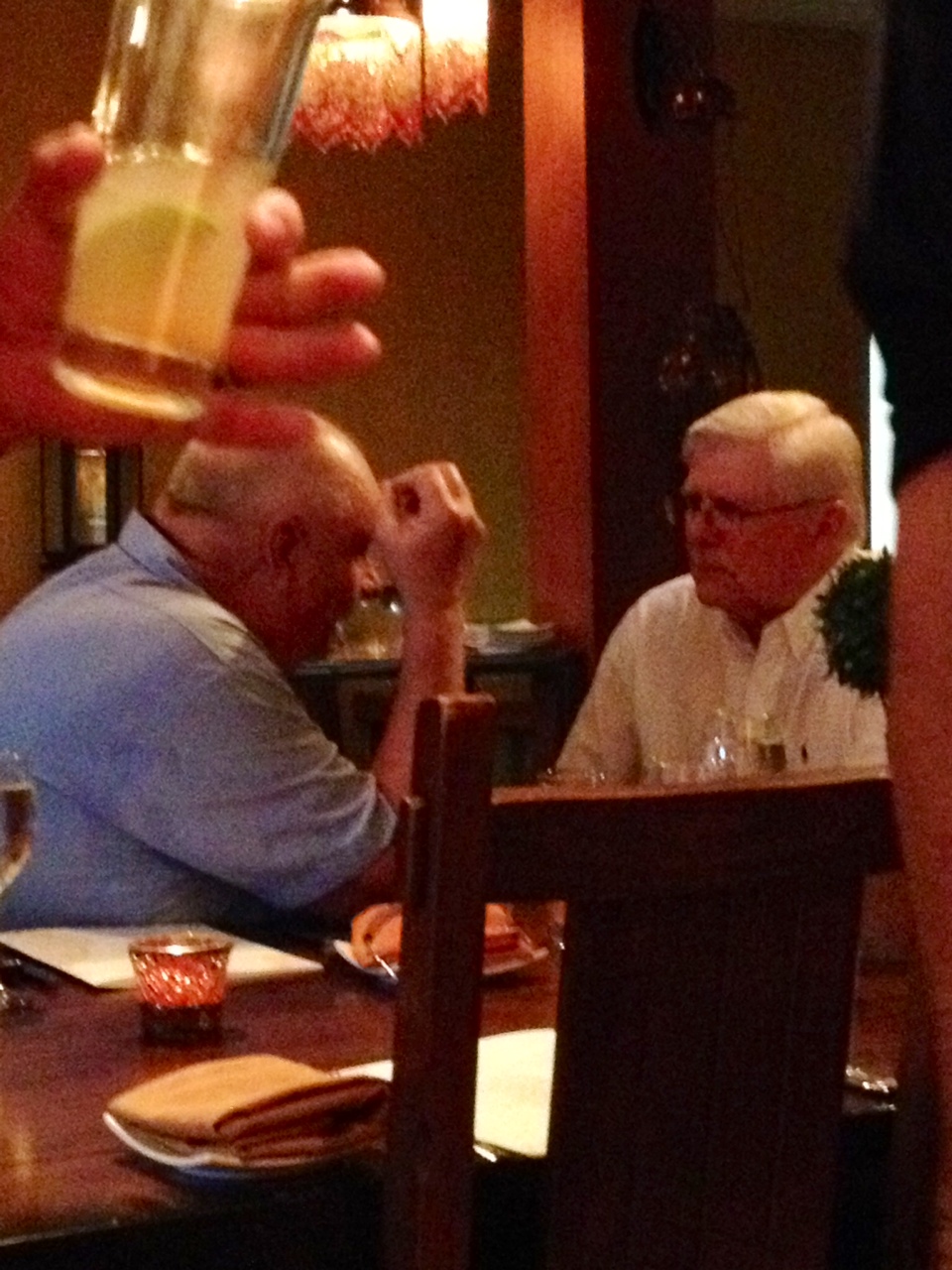 The waiter interrupts by putting a large platter of hummus and Lebanese pita bread in the middle of the wide table. Billy Bob looks at it. He’s hungry. He’s never seen anything like this. He’s wondering what it is and what to do with it. “Frances!” he calls out to the other side of the room. Frances, who’s recovering from hip surgery, walks to where we’re sitting. “What’s this?” “I don’t know,” says Frances, “I’ll ask Bonnie, maybe she’ll know,” and walks across the room to Bonnie and Mike.