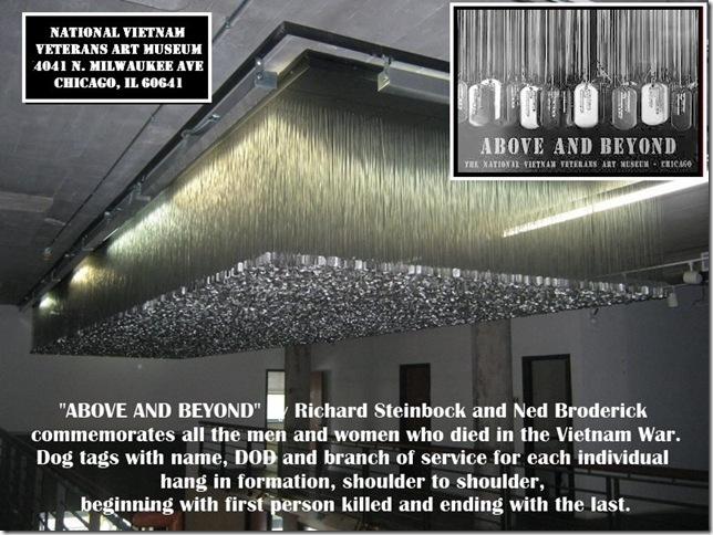 The metal dog tags of the more than 58,000 service men and women who died in the Vietnam War move and chime with shifting air currents. The 10-by-40-foot sculpture, entitled “Above and Beyond” was designed by Ned Broderick and Richard Steinbock.