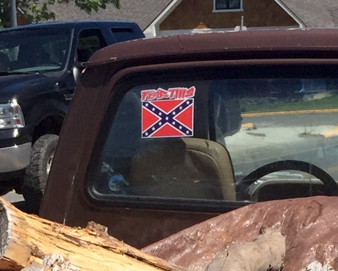 Walking into the library this morning I noticed a pickup truck with a Confederate flag decal on the back window of the cab. The hackles went up on the back of my neck. The urge to scratch the decal from the window momentarily crossed my righteous mind until I took note of something else.